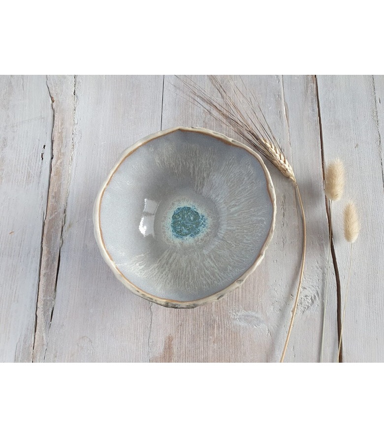 Handmade Bowl made of ceramic & pottery microwave and dishwasher safe. Colors: white, yellow, blue, green Width 5.5” / 14 cm, height 1.6”/ 4 cm